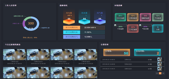 走进办公室里,经过艺术化表达的可视化的数据图形,通过高清超大激光屏的直观显示。食堂工作人员的健康状况、水电气能源消耗、工作区温湿度等数据,经由表格、图标、统计图等组件及SVG特效处理,帮助负责人实现对食堂的精细管理和运营,进一步提高效率和工作水平。