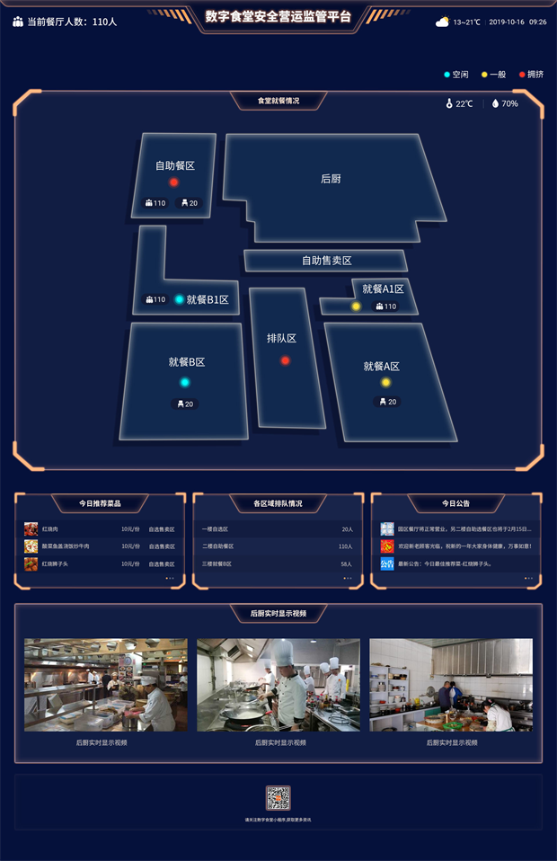 顾客也可以通过大厅显示屏或手机端游客界面了解一些食堂排队情况、大厅就餐环境、今日菜单等基础信息,起到有效引导顾客合理分流就餐和科学化供餐。