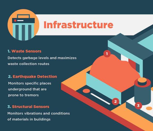 智慧城市通过确保建筑物和道路的稳定性来改善其基础设施。诸如地球探测器之类的创新技术可以监视更容易发生地震的区域和结构,从而使该城市能够准备和验证其基础设施。费城和首尔等城市也正在使用物联网,以使更多的汽车远离道路并减少废物收集。例如,首尔通过在城市周围安装智能垃圾箱,减少了83%的垃圾收集。