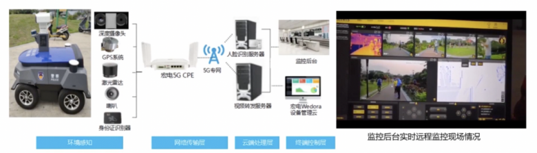 比如,宏电介绍了5G+公安无人巡检机器人项目,采用5G CPE/工业网关设备的警用巡检机器人具备主动人脸识别、可见光+热成像监控、紧急呼叫、语音对讲、强声驱散、语音播报等功能,能减少人力成本,提高巡检效率,让社会更安全。