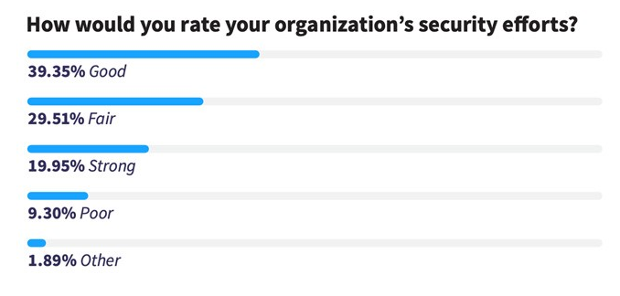 开发人员和安全团队之间仍然存在明显的脱节,不确定谁应该负责安全工作。与测试人员(23%)和运营专业人员(21%)相比,超过25%的开发人员表示对安全负责。