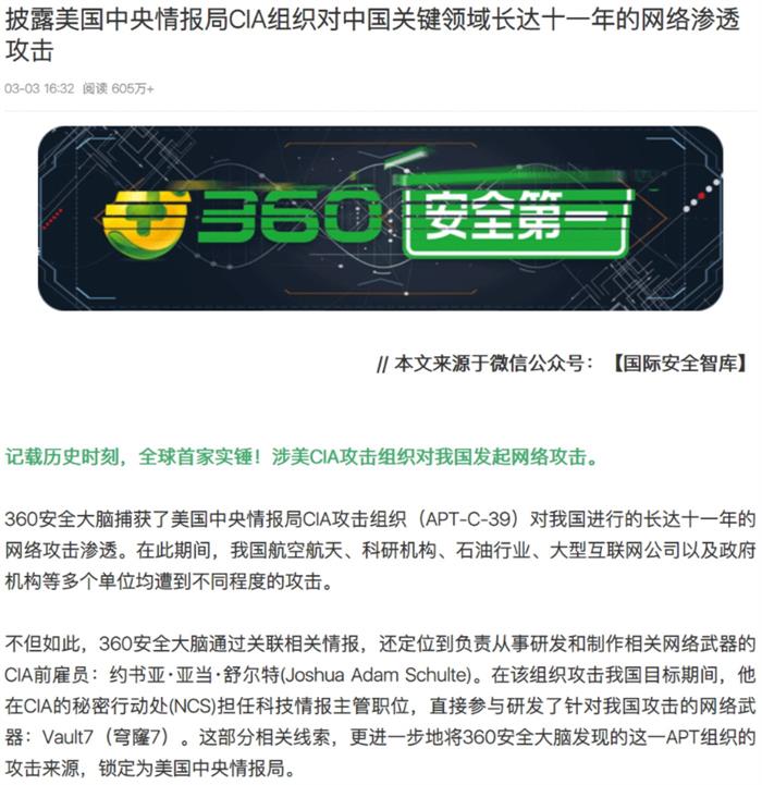 3月3日,360发布一条信息,揭开了美国中央情报局对中国长达11年的网络渗透的攻击行为,这则新闻被认为是360被制裁的原因之一。因为,360在网络安全领域,其发展起来的技术,已经威胁到了美国在关键领域的领导地位,这是重中之重。