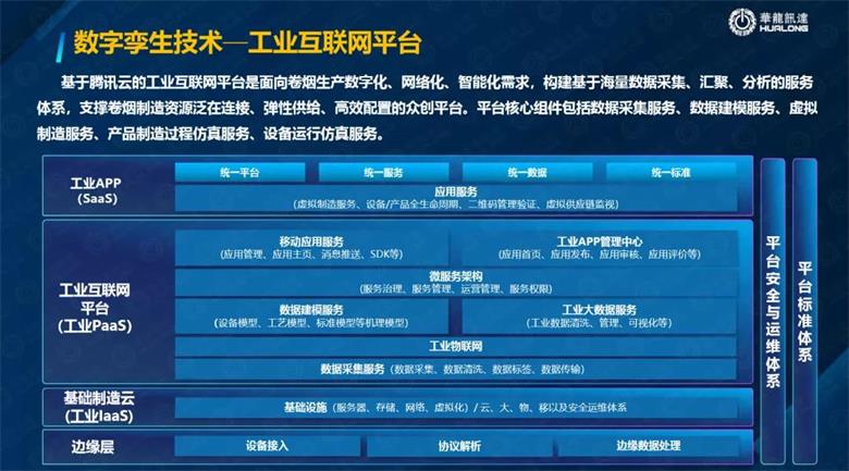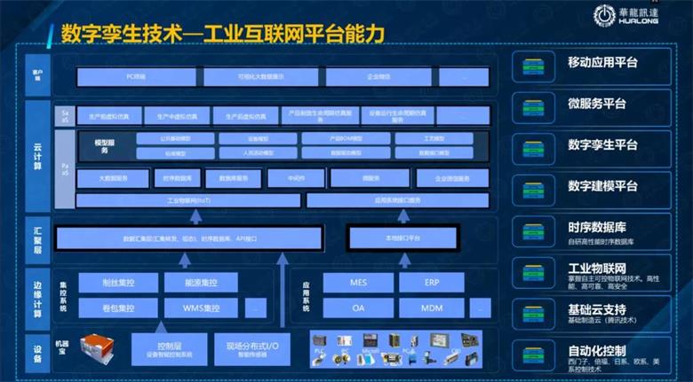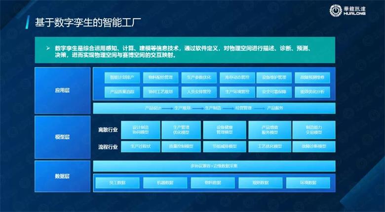 木星数字孪生平台是我们华龙迅达11年来的数字孪生的技术,我们20年代的自动化的技术,我们有10几年的数字化的技术,我们有将进五六年和腾讯一起的云平台技术,所以说我们利用这个技术我们打造了从数字孪生设备到数字孪生生产线到数字孪生车间一直到数字孪生工厂的基于云运用的一个数字孪生平台。数字孪生技术他离不开自动化控制技术, 因为只有在自动化控制领域里面寻找他的模型,他管理才可以继续有效的跟踪分析, 所以说整个工艺过程当中最直接把工艺进行控制的就是装备 所以说这个设备你是不是一个智能装备,是不是一个智能的生产线,你的控制系统是不是智能的取决于你的管理是不是智能的。还有很多像是智能工厂、智能服务、智能赋能技术和工业网络等等。这就是全产业的数字孪生的应用,数字化生产的新模式,网络化协同的新模式,服务化转型的新模式,产业链数字孪生新标准,这都是数字孪生里面要进行有效管理的。还有工业互联网的安全保障 ,大家都知道现在的数据安全比防线很重要,你在生产线上你的数据被人家黑了之后 你的工艺就会改掉,你生产就是那个次产品,所以这个数据安全也是很重要。