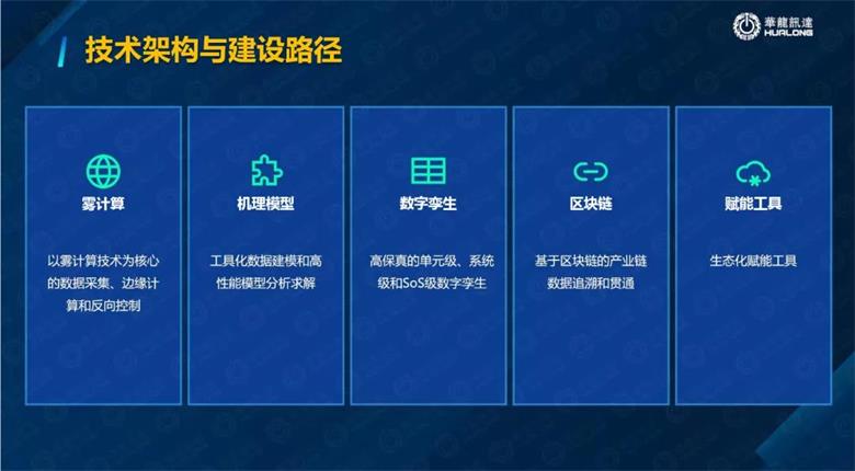 在整个技术框架过程中,我个人理解,应该把雾计算放在其中,以雾计算技术为核心的数据采集、边缘计算和反向控制,再就是机理模型,工具化数据建模和高性能模型分析求解,还有就是数字孪生,高保真的单级、系统级和SoS级数字孪生,还有区块链,基于金坷垃的产业数据追溯和贯通,最后是赋能工具,生态化赋能工具。