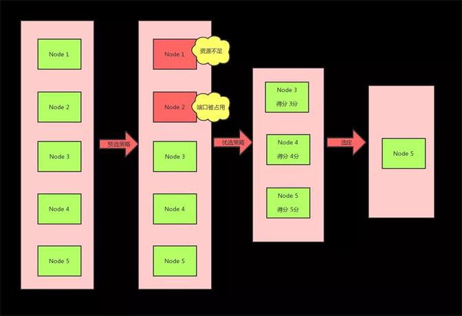 ●打分, 在选择出符合要求的候选节点中,采用优选规则计算出每个节点的积分,最后选择得分最高的。