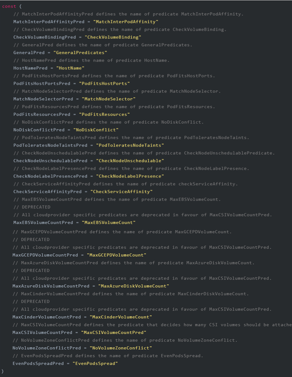 预选的算法可以参考源码predicates.go(https://github.com/kubernetes/kubernetes/blob/master/pkg/scheduler/algorithm/predicates/predicates.go):