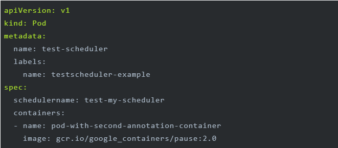 比如下面的 pod 选择 test-my-scheduler 进行调度,而不是默认的 default-scheduler: