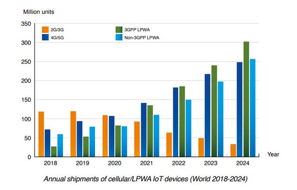 由于价格压力增加以及低成本LPWA模块在产品组合中的份额增加,年收入增长放缓至7%。低功耗广域通信的3GPP规范LTE-M和NB-IoT将在未来五年内为增长做出巨大贡献。虽然发达市场的5G覆盖范围正在迅速提高,但5GIoT模块要到2020年下半年才能大量投入商业使用。首批支持5G的产品将是路由器和网关,它们可能在年底前投放市场。配备5GIoT模块的乘用车计划于2021年发布。5G的其他目标IoT应用是视频监控和其他多媒体应用,这些应用如今依赖于有线通信。