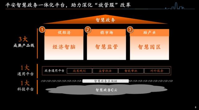 我们可以从三个维度去审视平安智慧城市现在在做的事情。政务、市场以及社会。