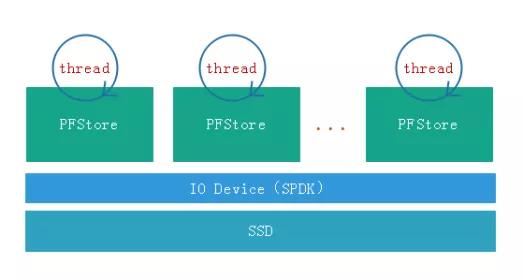 但在实际中一个 CPU 的 core 并不能完全发挥出一块 NVMe SSD 的全部性能,所以我们在一个进程中启动多个独立线程,每个独立线程绑定一个 PFStore,而不同的 PFStore 分别管理不同的 SSD 的物理空间,如下图所示。
