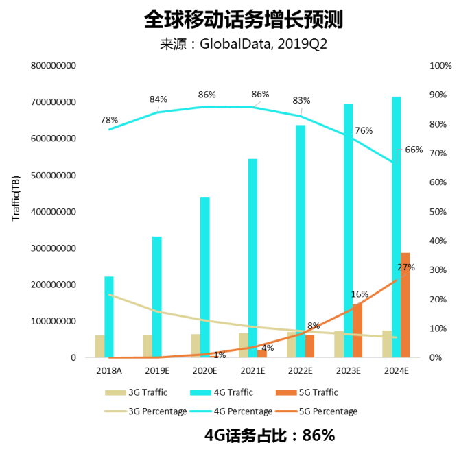 再者,4G目前的用户数正如日中天。据知名咨询公司GlobalData的估计,目前约有86%的流量承载在4G上,妥妥的是运营商的赚钱机器。