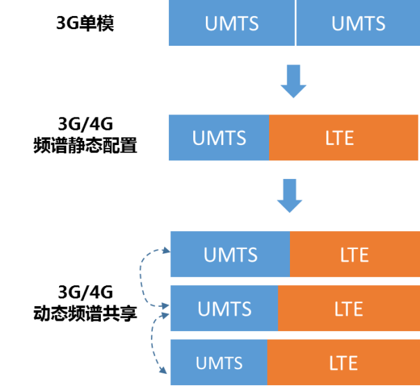 虽然标准的3G载波需要5M带宽,但实际上,在话务量较少,可以适当忍受速率损失的场景,将其压缩到3.8M乃至2.6M也都是能工作的。这样一来,3G占用的频谱就可以按需伸缩,动态和4G共享。