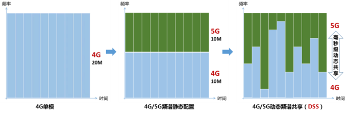 到了5G时代,协议定义了动态频谱共享(DSS,Dynamic Spectrum Sharing)技术,可以让4G和5G可以毫秒级实时共享同一段频谱,4G需求多了就给4G多分一些,5G流量上来了就给5G多分一些,完全按需调度,杜绝频谱闲置。