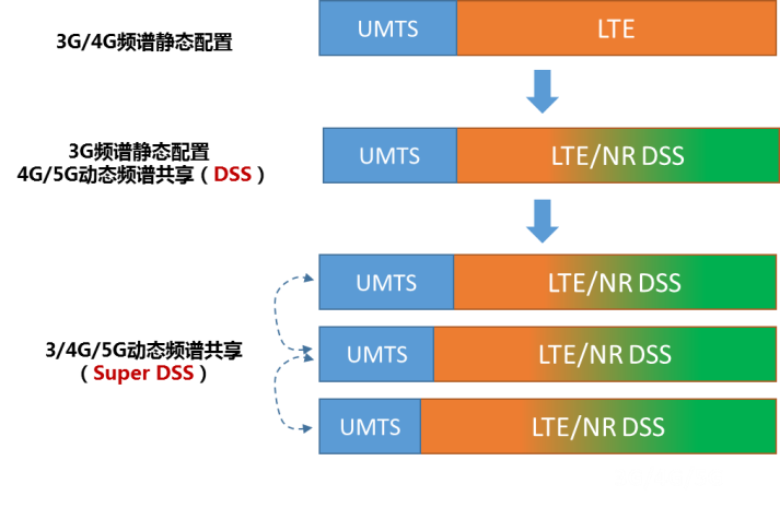 然而标准的DSS只考虑了4G和5G之间的频谱共享。但实际上,较低频段上除了4G之外,一般还存在2G或者3G,这就需要对这个技术进行增强,从4G/5G双模扩展到多模,使其可以在3G,4G和5G之间动态共享频谱。