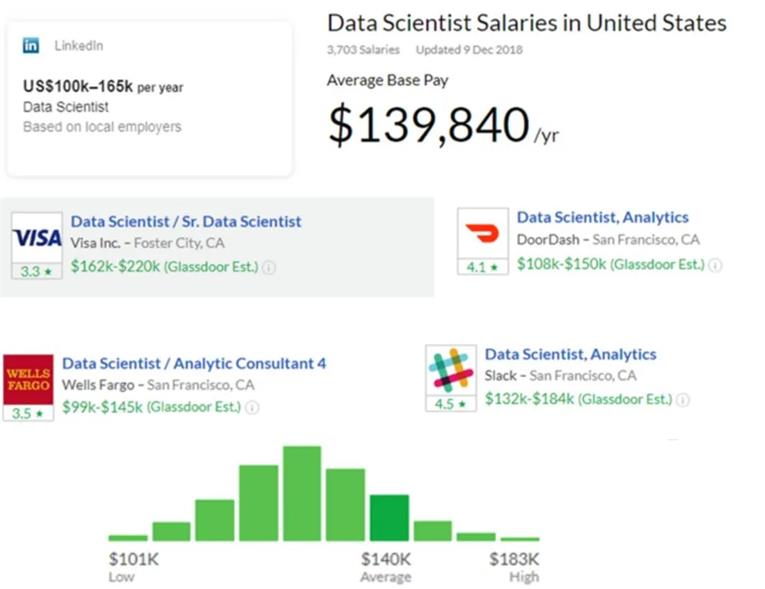 数据显示,在2018年,初级数据科学家的平均工资为11.5万美元/年,能够管理10至15人团队的数据科学家则可以拿到35万美元的年薪。