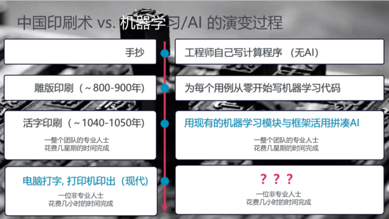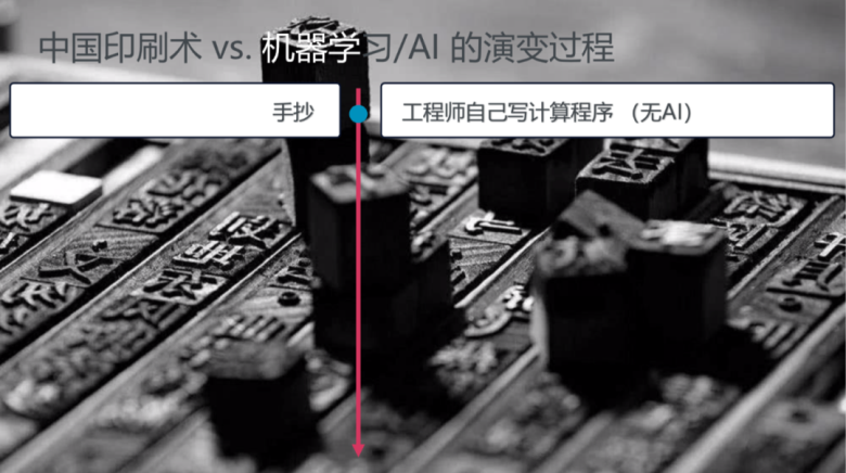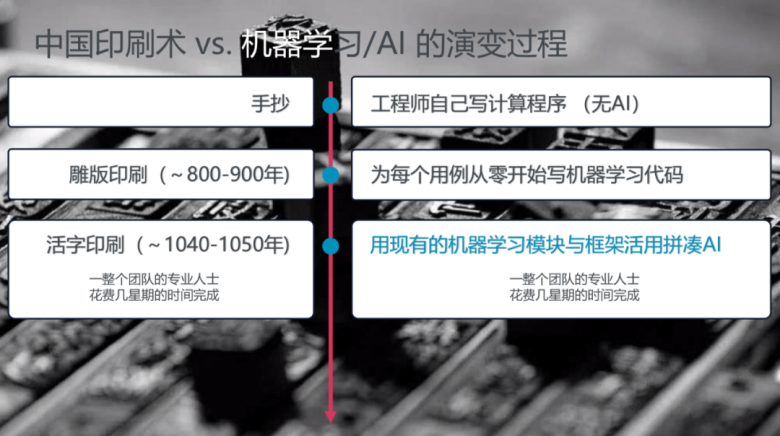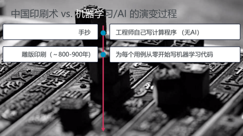 就像在人工智能的初始阶段,工程师们为每个用例,从零开始写机器学习的代码,一个用例对应一块“雕版”,在不同用例之间代码很难重复利用,灵活性差、对工程师的技艺要求高。