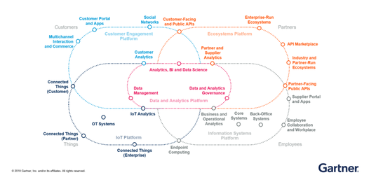 数据中台的建设方向应该处于企业数字化平台的核心,即Gartner定义的数据和分析平台(红色虚线部分),帮助企业的数字化平台(客户体验平台,生态系统平台,物联网平台和内部信息系统)的业务用户做出更好的决策,并在各个数字化平台的合作孵化下形成可复用的数据分析能力。数据分析能力应该在业务端无处不在且高度自助,最终助力数字化平台实现Gartner定义的封装的业务能力 (Packaged Business Capability)。