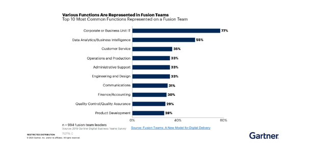 企业在渐进式数字化转型时面临的一个共同问题,他们各自为政,分别构建类似的解决方案,例如针对不同业务目的的数据分析模型,而这些模型具有共同的元素。在最好的情况下,这样做会造成重复,但更多的情况下,这也会增加复杂性,因为这样做会产生不同的点式解决方案,即使在单个业务内也无法沟通,更不用说在全公司的业务价值链上了。从这个角度来看,Gartner更推荐企业把数据中台定性成一个组织战略,把数据分析团队作为数字化平台建设必备的一个元素。Gartner也在2019年的《Gartner 数字化业务团队问卷》中发现,数据分析/商业智能是融合团队(Fusion team)中除IT以外最常见的功能。