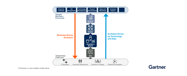 分析时刻是Gartner定义的一种数据分析流程,通过对数据进行可视化、探索和应用算法,支持业务成果的交付,从而做出更好或更快的决策,实现业务流程的自动化。在这个例子中,数据分析能力(最右侧)是被逐步建立起来的,他们的背后有大量的厂商可以被选择,这些能力可以多大程度的被其他分析时刻复用,多低的门槛可以被业务应用,直接决定了数据中台的成功。其中厂商的能力可以通过Gartner每年数据分析领域的九张《魔力象限(Magic Quadrant)》及配套的《关键能力(Critical Capability)》报告进行评估。