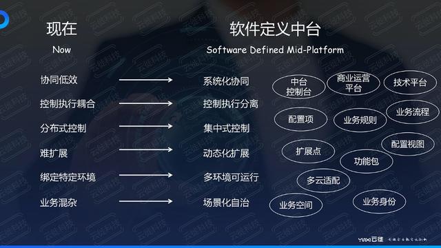 具体到软件定义中台,云徙科技希望通过软件定义理念来解决的是中台建设中各个角色和职责的明确,从而改变过去中台建设协同难的局面,并通过解耦运营层、控制层和执行层来实现统一运营、集中管控和柔性执行。