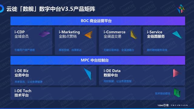 据悉,云徙科技「数舰」数字中台V3.5产品线包含七大产品:商业运营系统层四个产品,i-CDP全域会员、i-Marketing全触点营销、i-Commerce全渠道交易和i-Service全链路服务,这四款产品以组件化的形式提供给用户开箱即用,用户可以在BOC商业运营平台里对这些组件进行拼装组合,再给更上一层的用户端、员工端、生态端操作使用;第二层则是业务中台和数据中台,沉淀了云徙科技近70个中台项目的业务中台商业能力和数据模型能力,这些能力可以直接服务了会员、营销、交易和服务全链路;底层则是i-DE Tech技术平台,提供了研发服务体系,大前端、网关、多云适配、开放等等需要的所有体系链产品和工具。