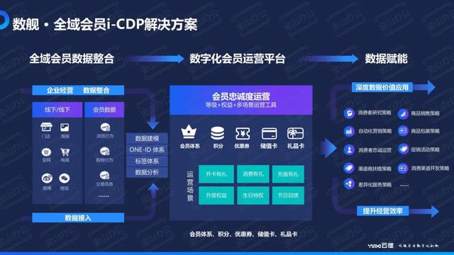 以业务运营系统i-CDP全域会员为例,利用的智能算法处理会员数据,生成用户唯一识别标示OneID。再通过OneID将渠道上的会员、订单、商品、以及会员的卡、券、积分等关键业务领域的数据全面贯通,统一储存管理。其作用是为企业解决多渠道不同会员系统分散化的问题,建立统一运营的全域会员系统,需要实现多方数据打通,数据建模构建起用户身份标识体系,从而支持各种营销应用,这背后其实需要技术平台+业务中台+数据中台各种能力来支撑与实现的。