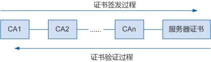 例如:CA1作为最上级CA也叫根证书,签发下一级CA2证书,CA2又可以给它的下一级CA3签发证书,以此下去,最终由CAn签发服务器的证书。
