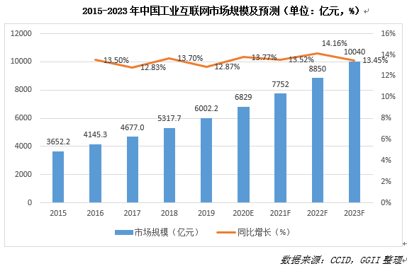 首先,这块蛋糕大到超乎想象。据高工机器人研究所(GGII)撰写的《2020年工业互联网行业分析报告》数据显示,2019年我国工业互联网市场规模约为6002亿元,同比增长12.87%。预计2020-2023年均复合增长率约13.6%,2023年中国工业互联网市场规模将突破万亿元。