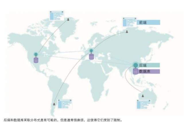 在我们通常使用的架构中,前端与后端进行通信,后端又与数据库和其他服务进行通信。后端和数据库通常会一起扩展,以保持后端和数据库之间的延迟处于很低的状态。分布式是有可能做到的,不过这通常很麻烦,这也使得它们受到了限制。