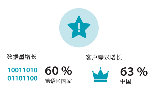与其他项目相比,数字化项目提出了更严格的要求。与老一套理念相反的是,受访者并未首先谈及成本。在德语区国家中,数据流的持续增长成为了过半企业面临的最大挑战。在中国,企业需要首先考虑顾客不断增长的需求。攀升的竞争压力成为了企业的动力,也构成了企业的挑战——如若竞争对手能以更快的速度成功转型,他们就能将业务席卷一空。
