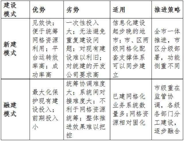 在新型智慧城市建设中成熟的网格化应用场景多为城管、综治、公安、环卫等部门独立建设的网格业务系统或区县级的综合网格化系统,地级市及以上的城市级综合网格化平台建设成功案例少且难以推广复制。目前,推进智慧城市的网格化建设一般有新建模式和融建模式两种,分析对比情况如下: