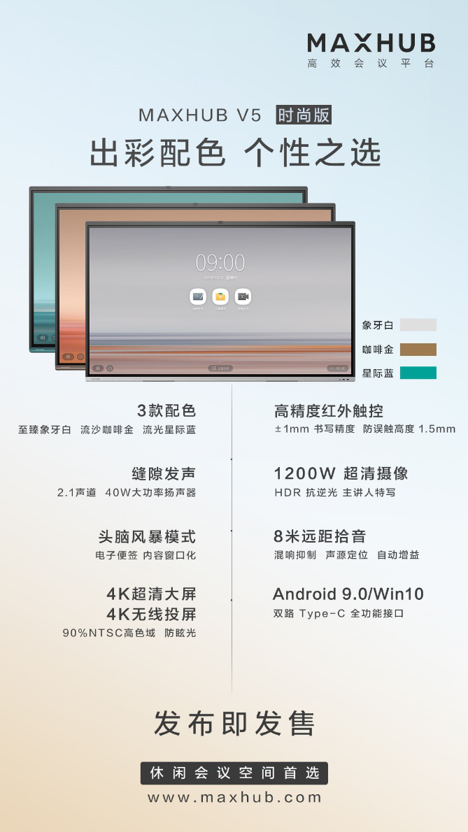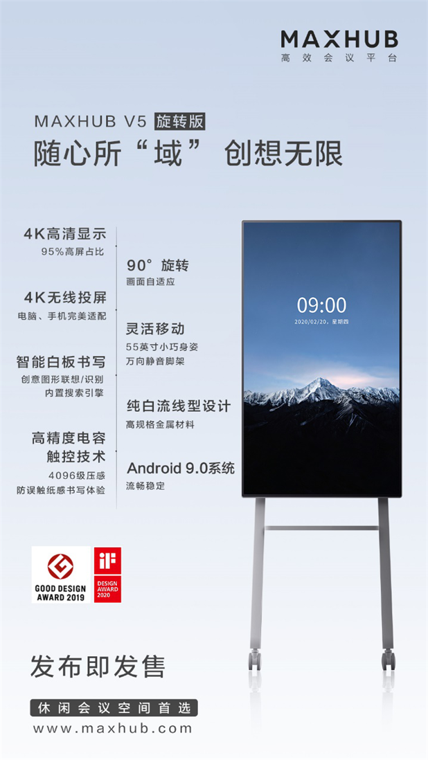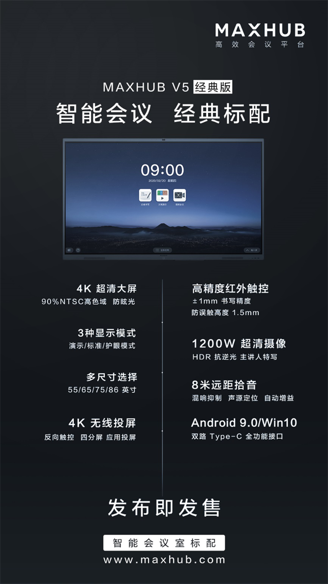 MAXHUB V5经典版,配置有4K超高清和4K高清UI显示,1200W像素摄像头让远程会议现场真实呈现,90%NTSC的高色域,画面品质卓越。兼容安卓9.0、Windows10和UOS三种系统以及type-c接口等配置,都让经典款成为传统会议室标准配置。值得一提的是,为了满足用户“在灵感到来的时候,立刻把自己的想法写下来”的办公需求,MAXHUB推出了“提笔即写”的功能。只需拿起笔,无需手动调取白板,便可以直接快速地进入书写状态,捕捉转瞬即逝的灵感。
