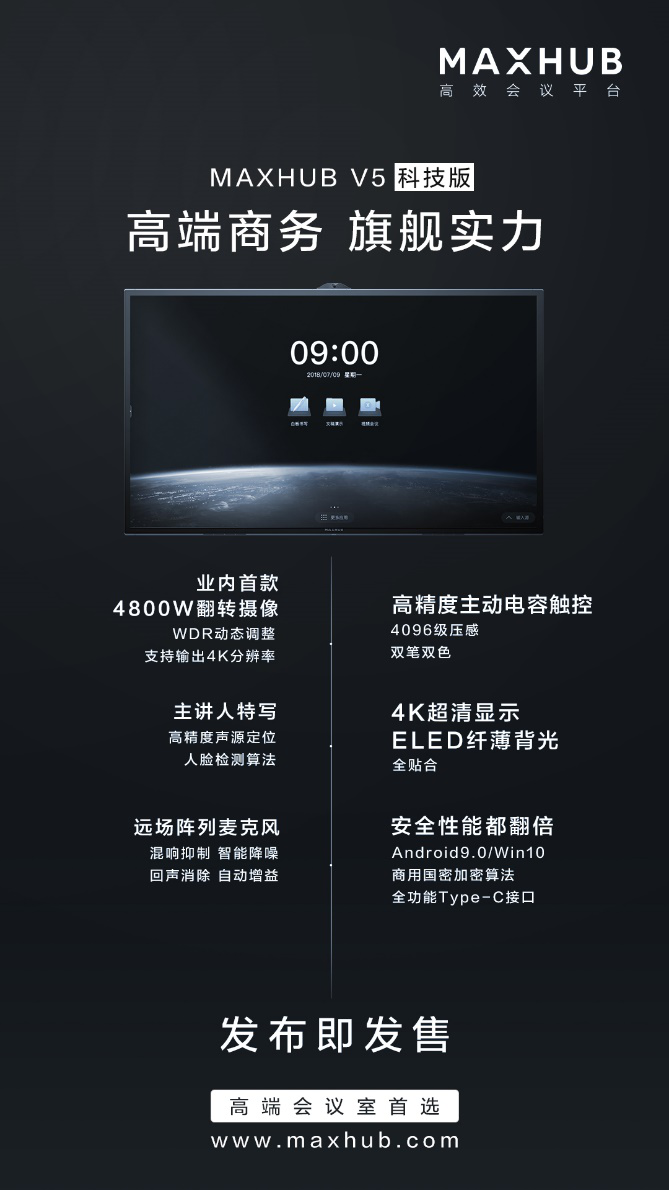MAXHUB V5科技版专门为高端会议打造。除了将发声处打造为超窄缝隙,营造细腻清晰音效的同时兼顾外形的艺术性与极致美感,从视觉感官上提升会议品质。为了避免误操作或恶意软件攻击带来的会议信息泄漏,MAXHUB 推出了全球业内首款翻转摄像头,不使用时隐藏摄像头。其次,V5科技版采用了商用国密加密算法,为无线传屏及云端信息共享提供了更专业的保护。基于此,MAXHUB也成为首个获得赛宝实验室会议平板类产品信息安全认证的产品。