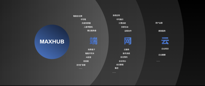 会上,MAXHUB产品经理张金成还发布了MAXHUB的产品布局战略——云+网+端。“端”代表会议平板、无线全向麦、笔迹、传屏盒子等办公设备;“网”代表会前预约、会中协作、会后管理等会议全流程场景应用;“云”则代表跟企业运营、业务协同相关的服务生态。