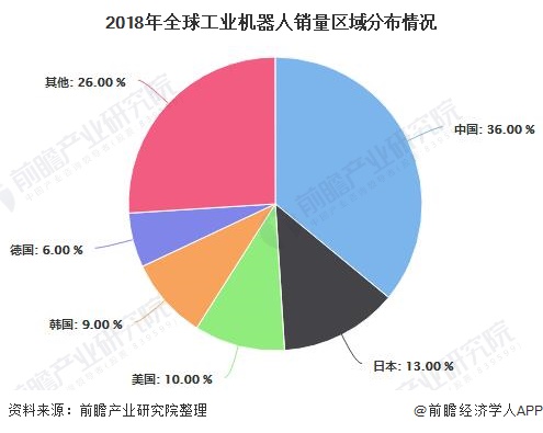根据IFR统计,2018年中国、日本、韩国、美国和德国五大工业机器人市场占到全球安装量的74%。其中,2018年中国工业机器人市场累计销售工业机器人15.6万台,同比下降1.73%,占全球的比重达到36%,但年销量连续第六年位居世界首位。
