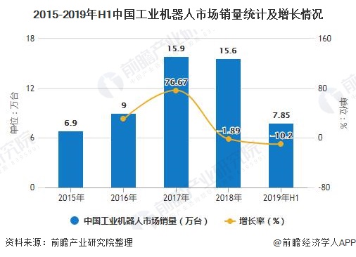 从具体销量来看,2015-2017年中国工业机器人不断增长,2017年增长至15.9万台,涨幅达到76.4%。2018年,由于工业机器人最大需求行业——汽车行业迎来28年首次销量下滑,3C行业增长也大幅度回落,这两大行业的投资情况更是断崖式下跌,所以工业机器人需求量有所下降,2018年同比下降1.7%;2019年上半年同比下降10%,销量约为7.85万台。