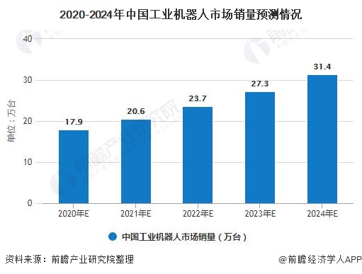 现阶段,中国工业机器人产业随着下游行业需求增速放缓,叠加政策退出,2018-2019年行业进入调整期,根据国外经验以及预测模型测算,前瞻预计,未来5年行业销量增速达15%,到2024年,中国工业机器人销量将突破31万台。