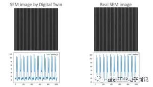 图2. 由SEM数字孪生生成的掩模SEM图像和真实SEM图像的两个示例。显示了在同一位置的水平切割线上的图像强度。不仅图像看起来非常相似,而且边缘的信号响应也相似。