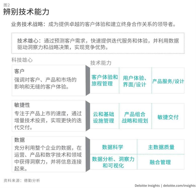 举一个假设性的例子,一家大型零售企业致力于成为“提供卓越的客户体验和建立终身合作关系的领导者”,多种技术野心都能使这一战略获得成功。最终,零售商决定将重点放在客户、敏捷性和数据上,以“通过预测客户需求、快速提供迭代服务和体验,并利用数据驱动洞察力和战略决策,实现竞争优势”。然后,零售商评估当前的技术能力,确定未来的需求,找出两者之间的差距,并确定能够培养这种技术目标的技术能力(图2)。