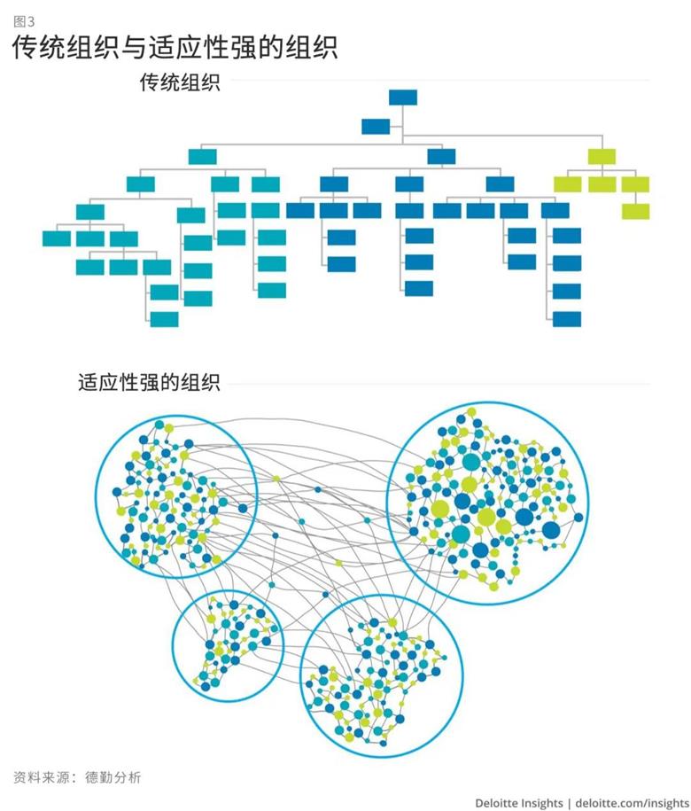适应性强的组织设计。要优先考虑人的因素,包括人与人之间的合作方式、非正式的关系和网络,以及客户的投入和反馈。这些组织的设计是为了承认和利用正式系统以及非正式网络——也就是那些通常比正式系统对行为和结果有更大影响力的联系和交流(图3)。