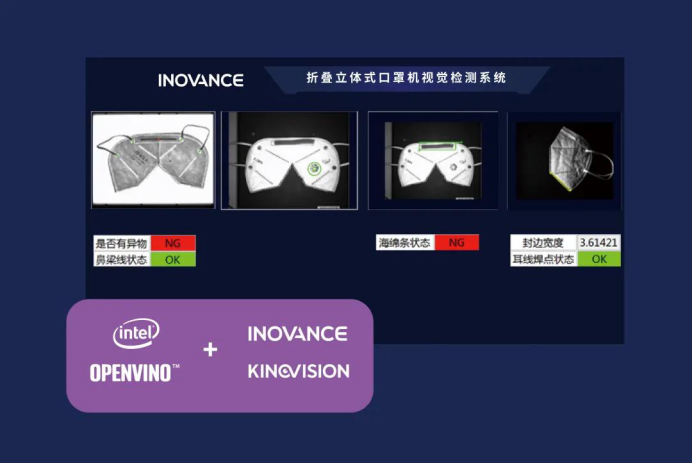 技术实现方面,这一系统是基于英特尔 X86 处理器,结合 OpenVINO? 图形处理加速工具所开发的。整个系统在口罩生产线的 4 个不同生产工位,部署了多台工业相机,通过图像抓取产品状态,并传输到汇川基于英特尔? 酷睿 i5 处理器开发的高性能计算平台 Kinovision上。Kinovision 平台通过边缘训练服务器进行在线训练,并根据训练好的模型进行实时推理运算,从而保证了缺陷检测的精准效果。