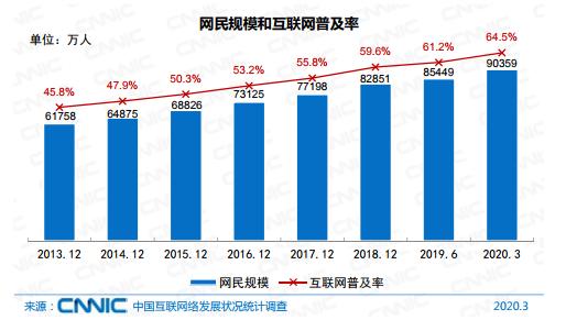 据中国互联网网络发展状况统计报告,截至2020年3月底,网民规模为9.04亿。