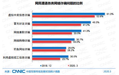 其中虚假中奖信息仍然是最常遭遇的攻击,占比为52.6%,冒充好友攻击的占比为41.2%,网络兼职攻击的占比为33.5%。