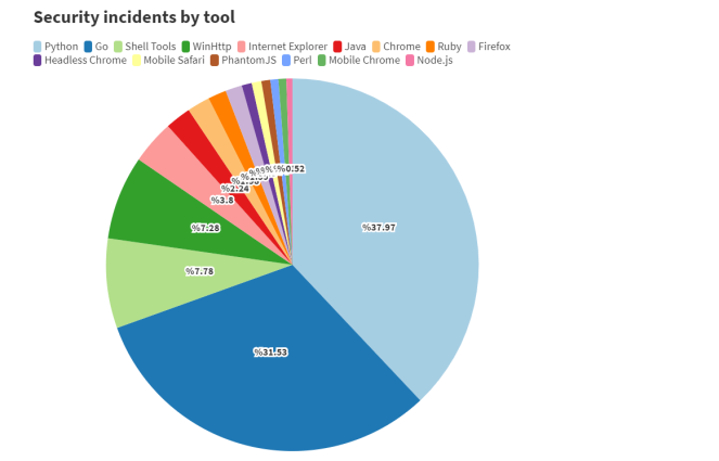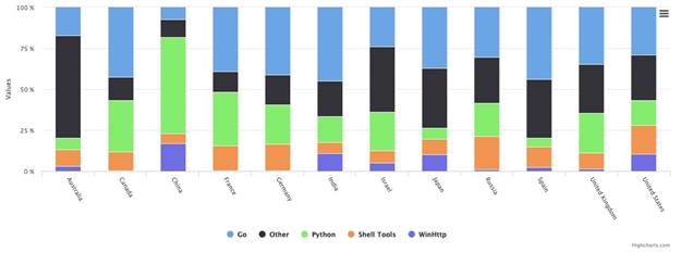 按工具来分类,Python 依旧是大多数黑客的首选武器,紧接着是使用量增长迅速的 Go 语言;再其次是 WinHttp 库,该库主要由 Windows 上运行的 .net 和 CPP 使用;Shell 工具(如 cURL、wget 等)也榜上有名。浏览器也是常用的攻击工具。