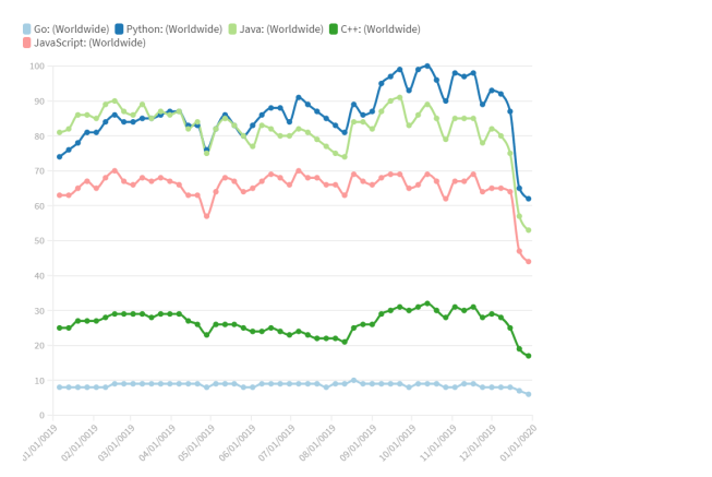 中国使用 Python 的比其他任何国家都多,而 Go 是印度的首选工具。