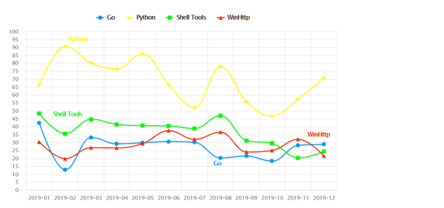 根据 GitHut 2.0 给出的统计信息,Python 和 Go 都在 2019 年的前五大语言中占有一席之地。于是,Imperva 公司又将目光聚焦到了 GitHub 上的网络安全项目。GitHub 虽然未对存储库进行直接分类,但 Security 主题下拥有超过 8,500 个与安全相关的库,而这些库中的主要语言分别为:长期排在第一位的 Python,其次是 Java、JavaScript 和 PHP,最后是 Go。前四位毫不令人意外,而 Go 是在 2019 年首次取代了基于 Shell 的代码,进入 top 榜。