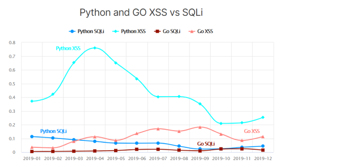 接下来,该公司又对两种最常见的攻击——XSS 和 SQLi——以及通过 Go 和 Python 使用这些攻击的尝试进行了观察。值得注意的是,到 2019 年底,Go 在两种类型的攻击中都赶上了 Python。不过,判断这种趋势是否会持续还为时过早,但 Go 变得越来越流行是毋庸置疑的。