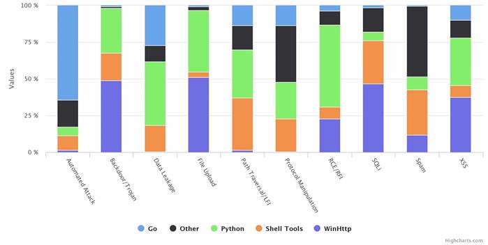 如图所示,Python 是 RCE/RFI、文件上传和数据泄漏中占比最大的工具,而 Go 在常规自动攻击中更强大。