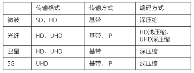 从上表中我们可以看出,随着高清到超高清的码流越来越大从微波、光纤、卫星向 光纤、卫星、5G 转变,从基带传输向基带+IP传输转变,从深压缩编码向浅压缩编码转变。基于这些变化,5G将趋向于流信号和多种分发方式的转变。