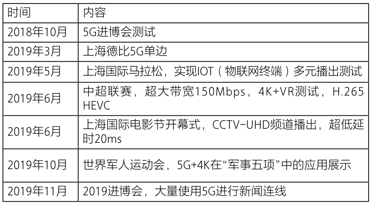1.SMG在5G场景下的探索时间表2019年7月,工信部给予中国广电发放了5G拍照。作为广电行业新技术的先驱,SMG早在2018年首届中国国际进口博览会上,就进行了基于5G的广电制作探索和尝试。具体的时间表和内容如下: